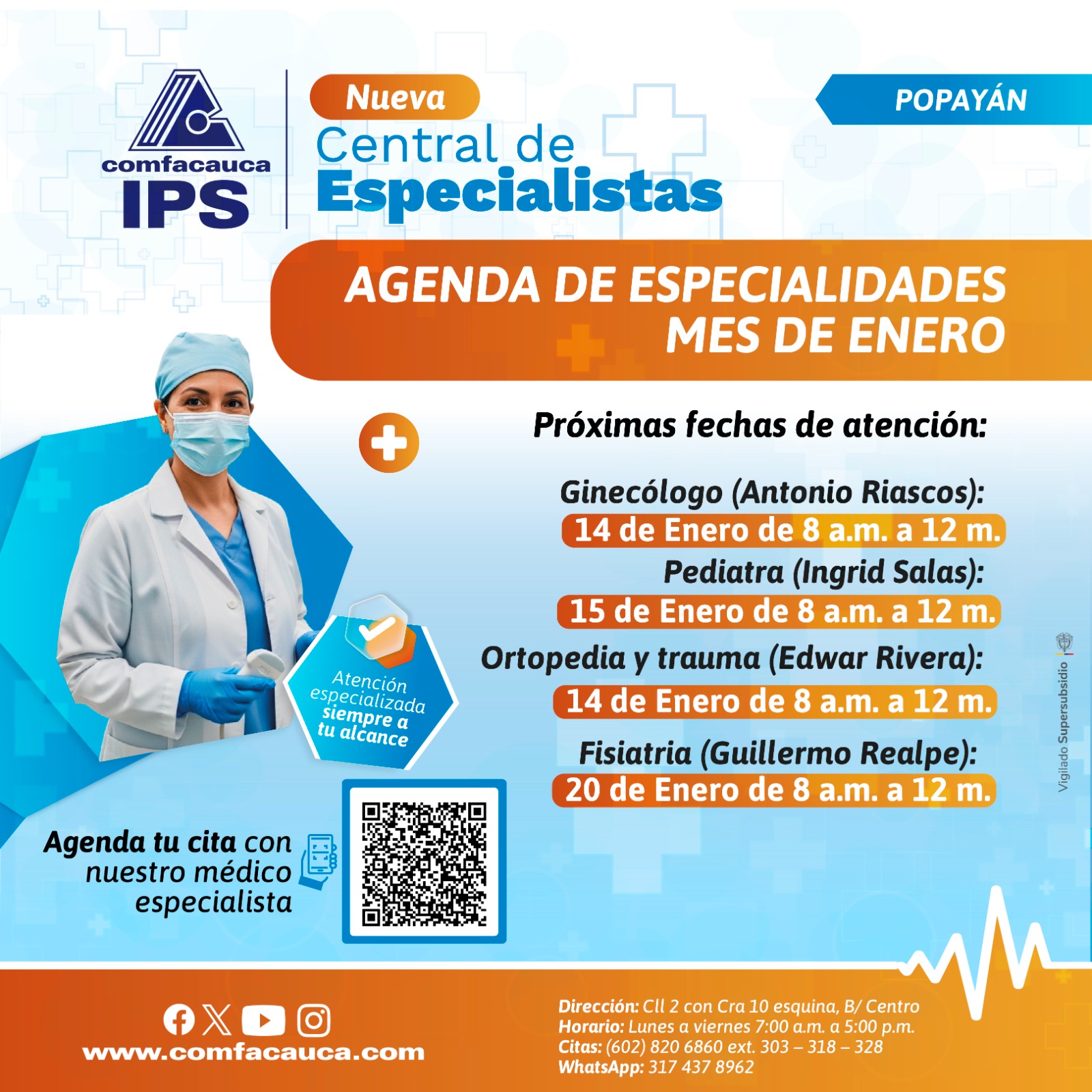 En la Central de Especialistas IPS Comfacauca – Popayán ya tenemos agenda abierta para enero con atención especializada para ti y tu familia.