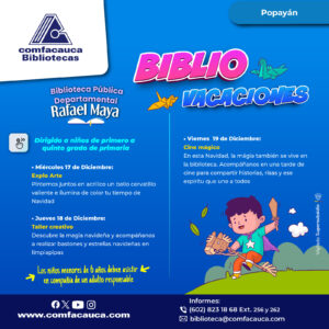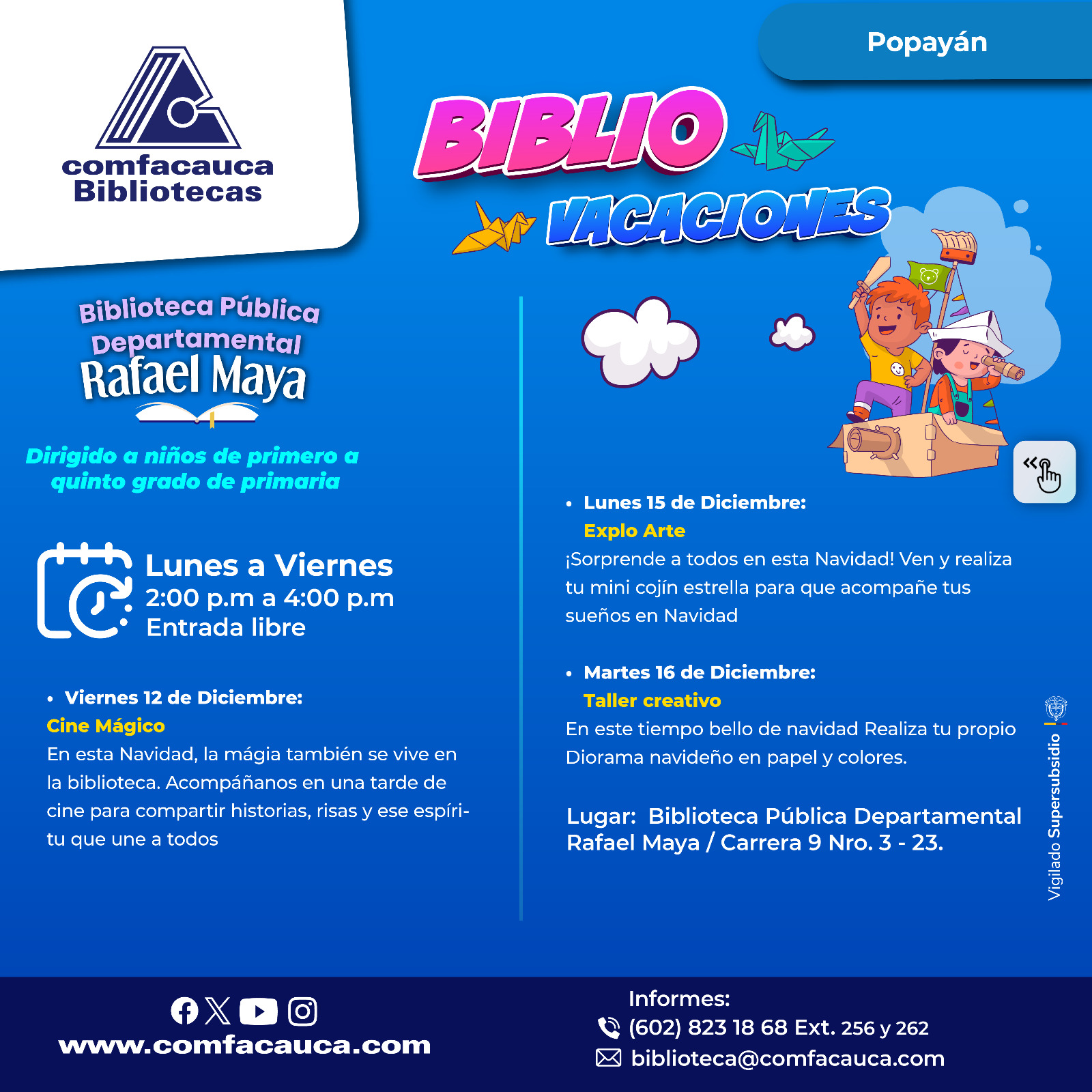 Nuestro programa de Bibliovacaciones invita a niños y niñas a vivir tardes llenas de arte, manualidades, pintura y cine, fortaleciendo su creatividad y amor por la lectura en esta época navideña ✨