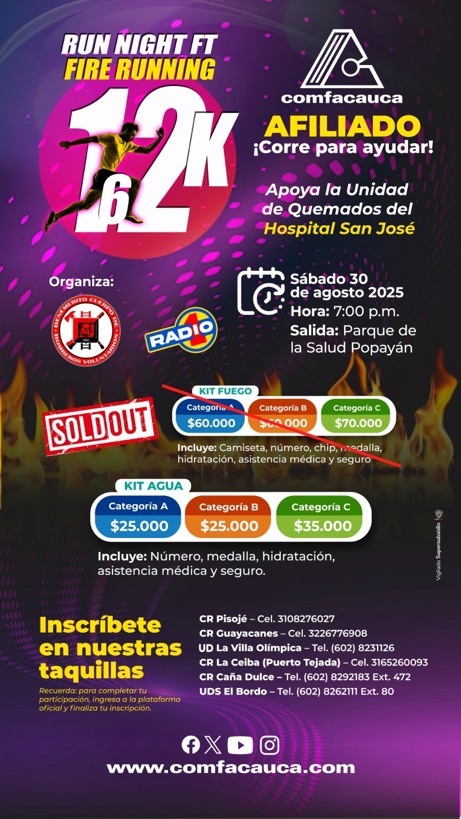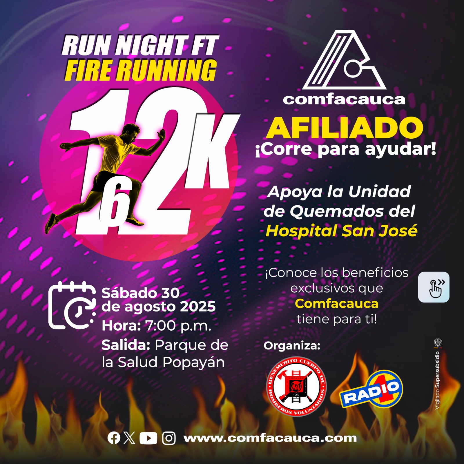 Este 30 de agosto vive la experiencia del 𝗥𝗨𝗡 𝗡𝗜𝗚𝗛𝗧 𝗙𝗧 𝗙𝗜𝗥𝗘 𝗥𝗨𝗡𝗡𝗜𝗡𝗚 en Popayán y elige tu reto: 𝟲𝗞 𝗼 𝟭𝟮𝗞💪✨. Al participar apoyas a la Unidad de Quemados del Hospital San José.🫂