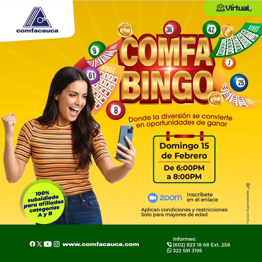 En COMFACAUCA te invitamos a participar en nuestro COMFABINGO VIRTUAL, una experiencia divertida donde puedes ganar ese dinero que nunca está de más 💸✨