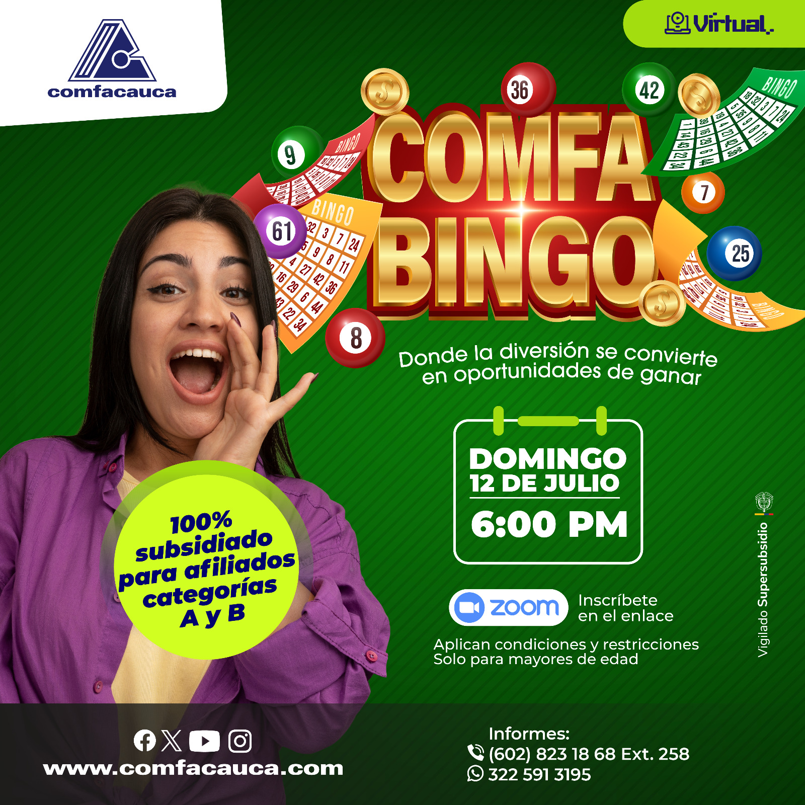 En COMFACAUCA te invitamos a participar en nuestro COMFABINGO VIRTUAL, una experiencia divertida donde puedes ganar ese dinero que nunca está de más 💸✨