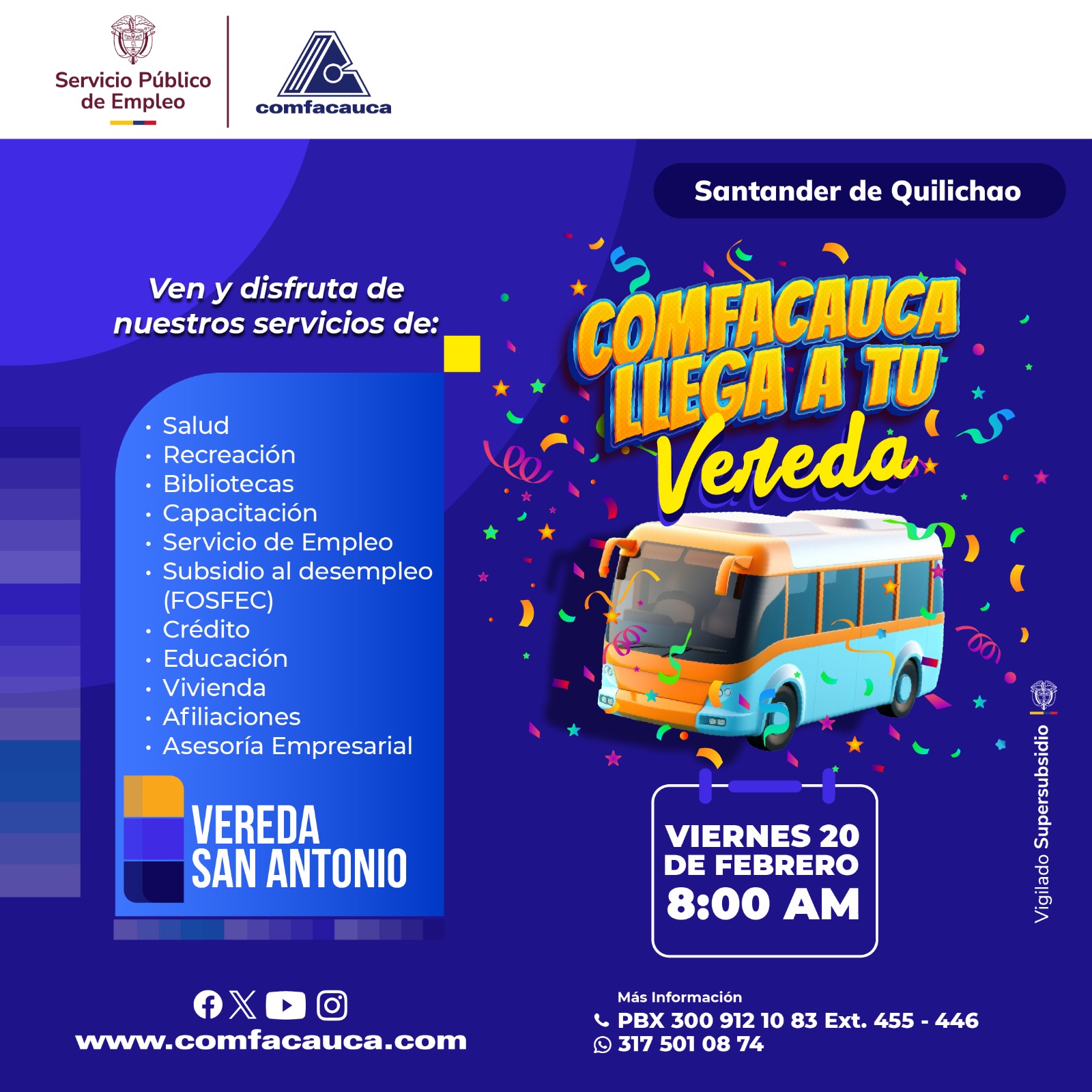 #Santander de Quilichao Comfacauca Llega a tu vereda este VIERNES 20 de FEBRERO desde las 8:00 a. m., estaremos en la oficina de la junta de accion comunal de La Vereda SAN ANTONIO con todos nuestros servicios en un sólo lugar 💼✨