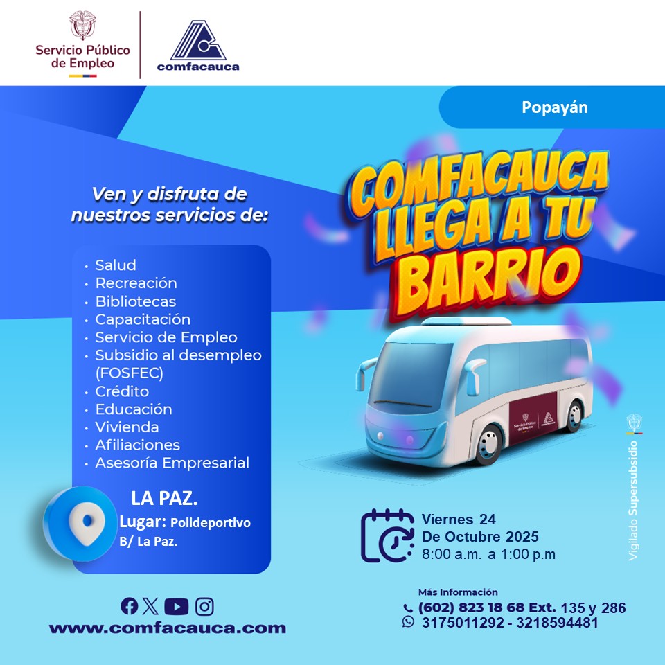 Éste VIERNES 24 de OCTUBRE desde las 8:00 a. m., estaremos en el polideportivo del barrio la Paz, todos nuestros servicios en un sólo lugar 💼✨