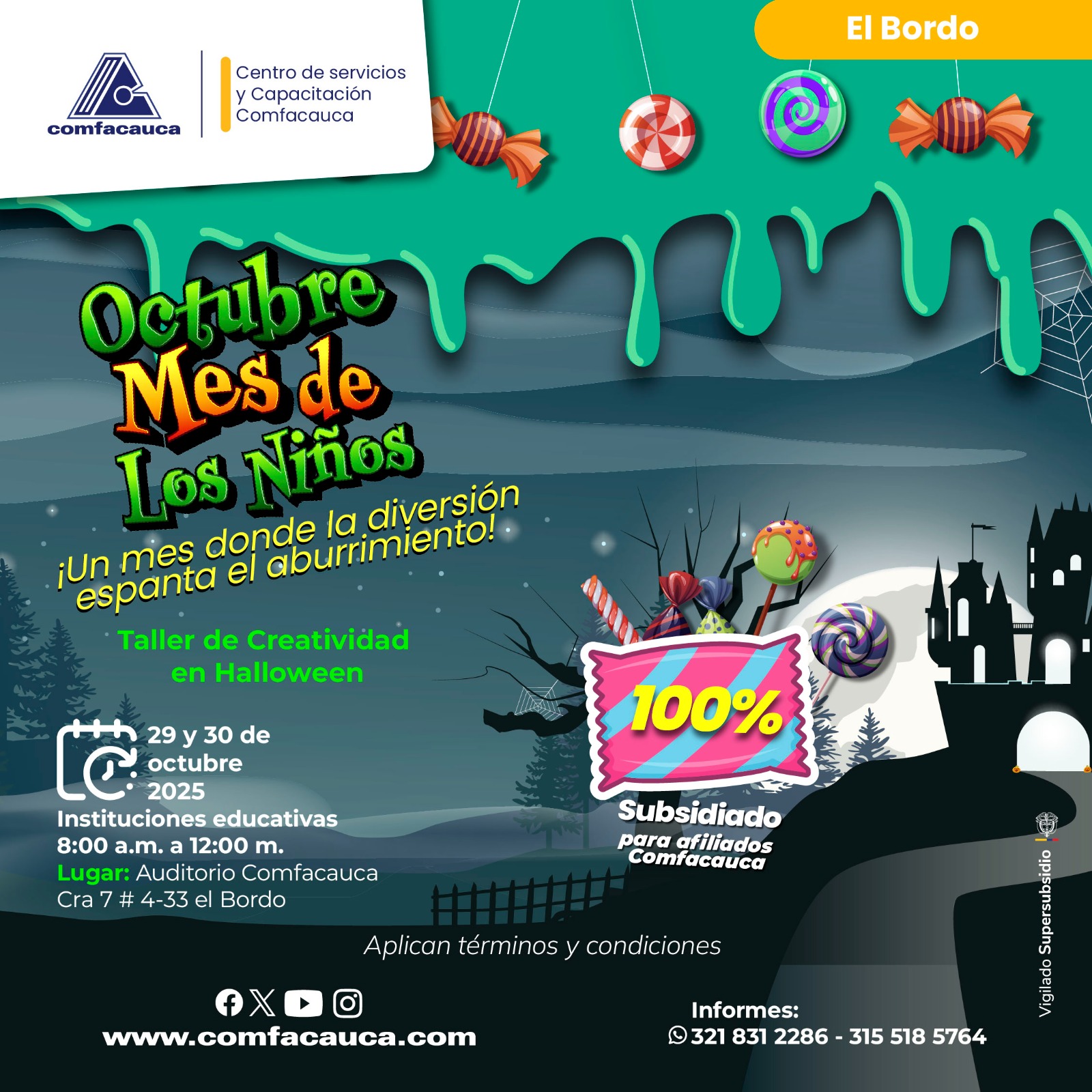 Comfacauca invita a todos los niños y niñas de las instituciones educativas de El Bordo a vivir una mañana llena de imaginación, alegría y aprendizaje en el Taller de Creatividad en Halloween. 👻✂️🎨