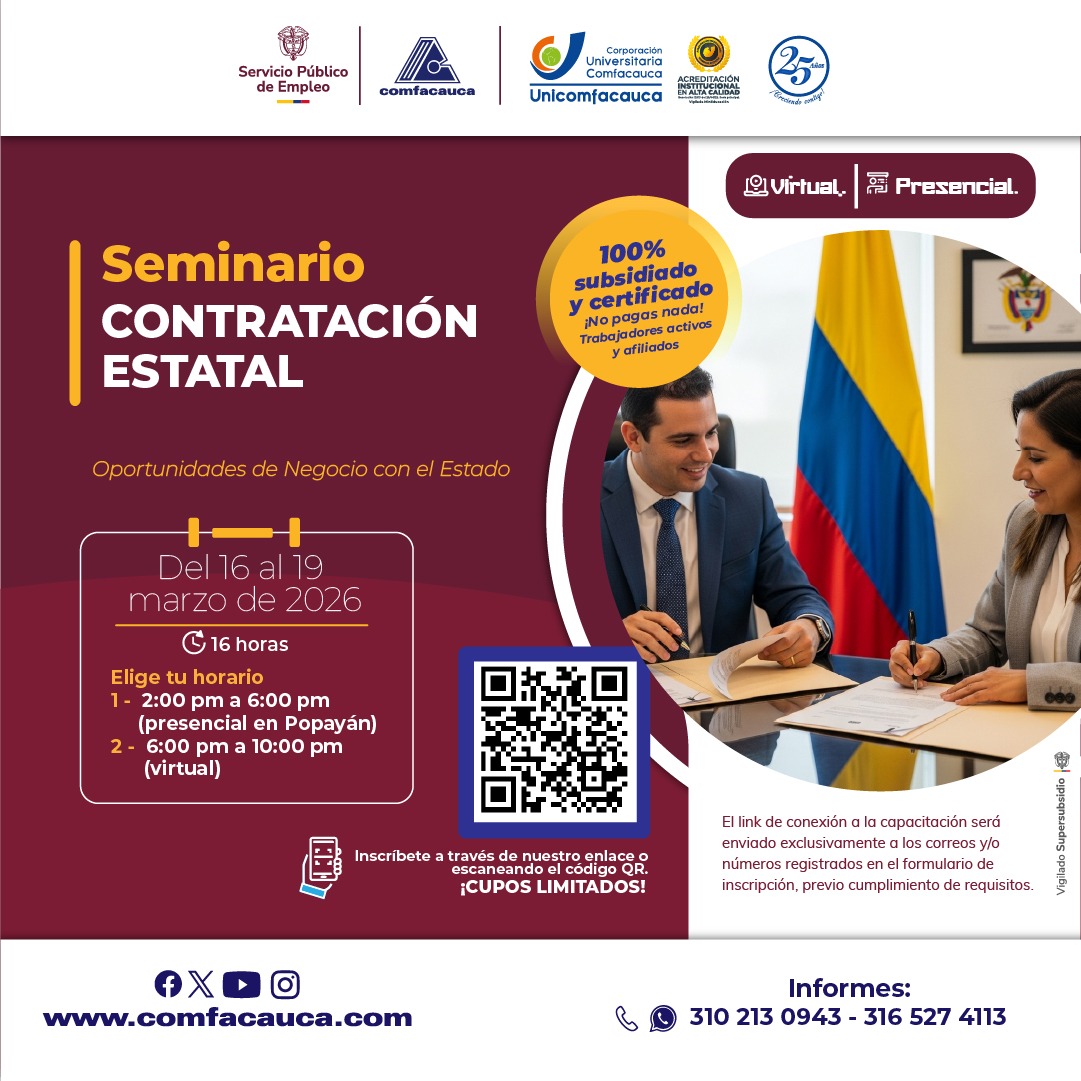 Capacitación 100% subsidiada (sin costo) y certificada para TRABAJADORES afiliados a COMFACAUCA
