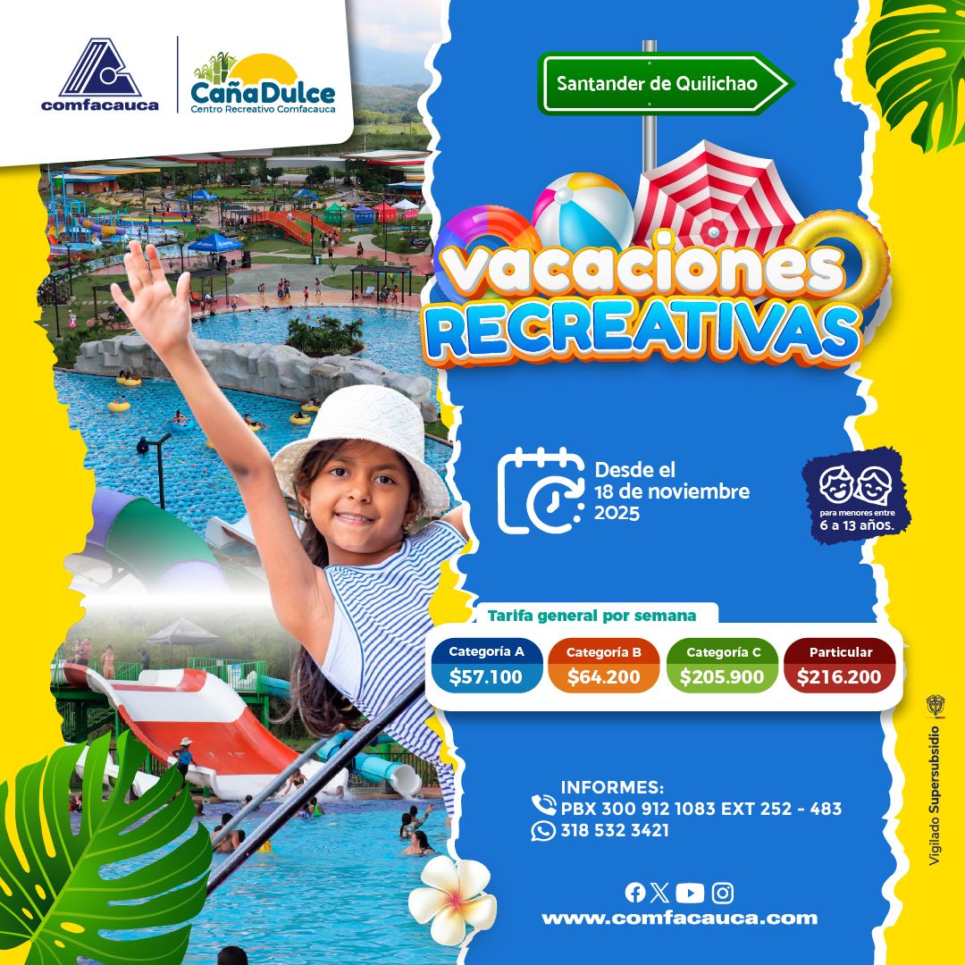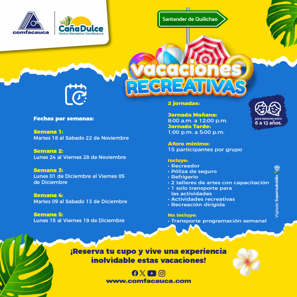 Vacaciones Recreativas Caña Dulce + Añadir Google Calendar Exportación + iCal / Outlook Fecha Nov 18 2025 - Dic 19 2025 Hora 8:00 am - 5:00 pm Ubicación/Plataforma Centro Recreativo Caña Dulce Servicios Recreación Modalidad Presencial Compartir este evento