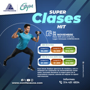 Es una actividad física que se desarrolla durante 45 minutos, sobre una bicicleta estática en los siguientes horarios: lunes a las 6:15 p.m. y 7:15 p.m. Martes a las 6:30 a.m. y 6:15 p.m. Miércoles a las 6:15 p.m.; Viernes a las 6:15 p.m. y Sábados a las 10:15 a.m. Spinning: Spinning es una actividad física que se desarrolla por aproximadamente 45 minutos, sobre una bicicleta estática. En el Gym Comfacauca brindamos clases de spinning con un cupo limitado los días lunes 7:00 a.m. y miércoles 9:15 a.m.