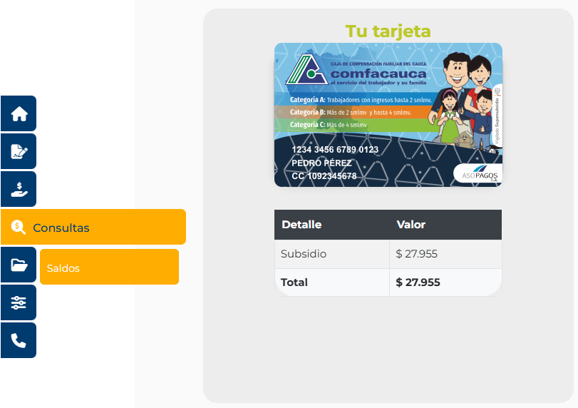 El saldo de la tarjeta lo puede verificar en la página de Comfacauca. Puede registrarse a través del link Comfacauca en línea http://enlinea.comfacauca.com/accesoweb/login.php